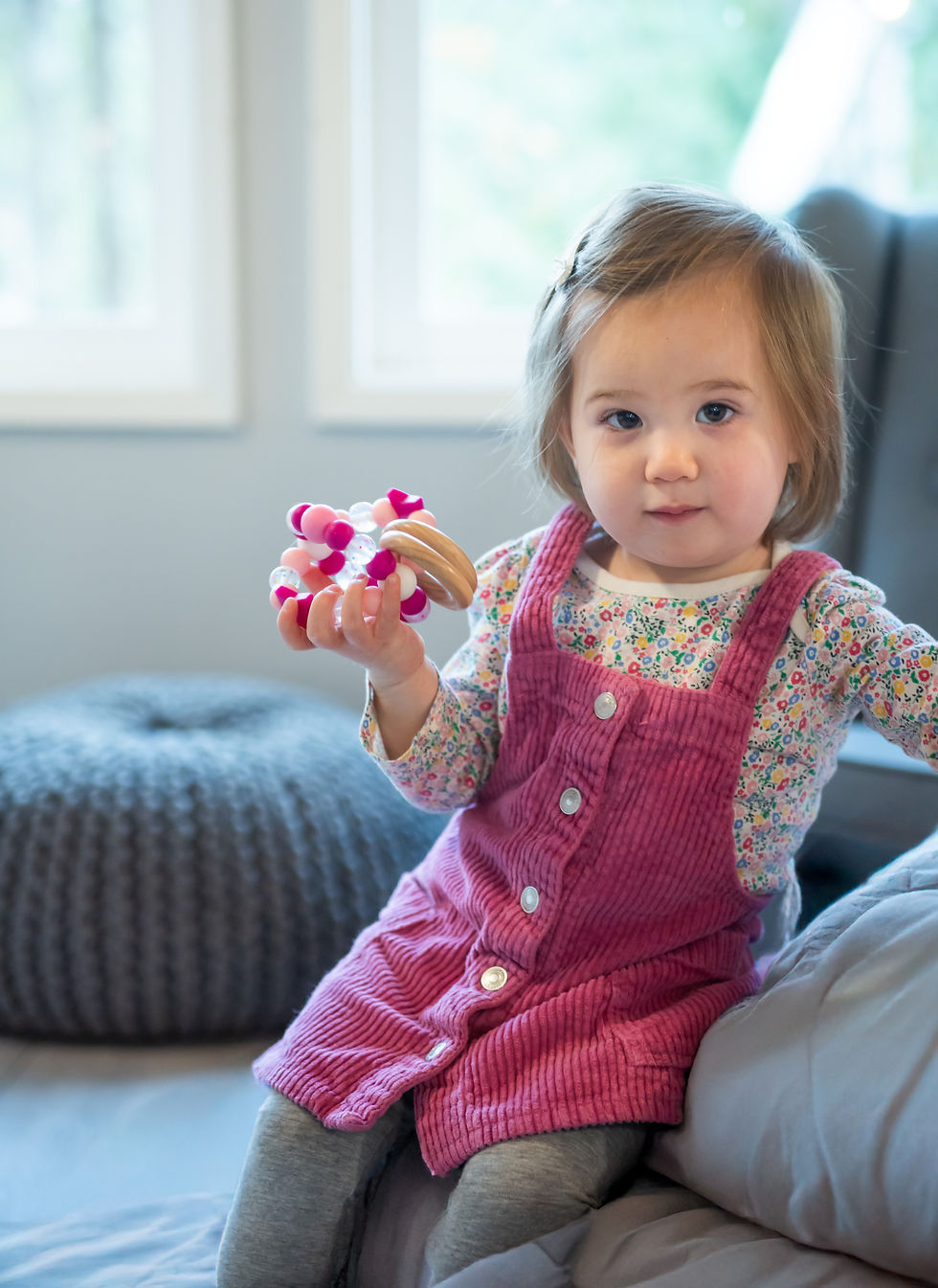 These Teething Rattles are the perfect dual purpose toy for your sweet, tiny teething human! Made from the same material as kitchen utensils, our silicone beads are soft but durable and can soothe sore gums while the wooden beads and rings provide a firm surface to release pressure while cutting teeth.